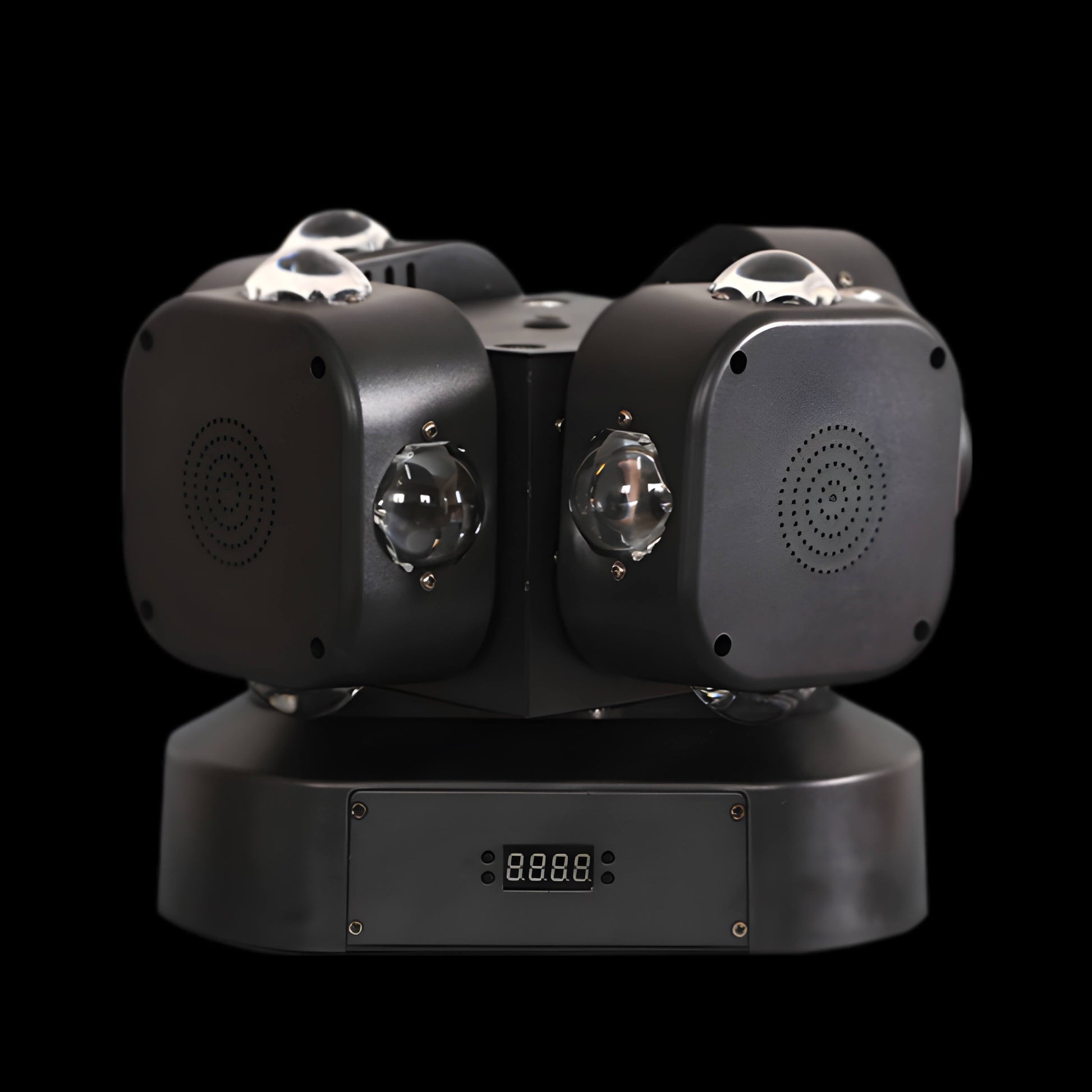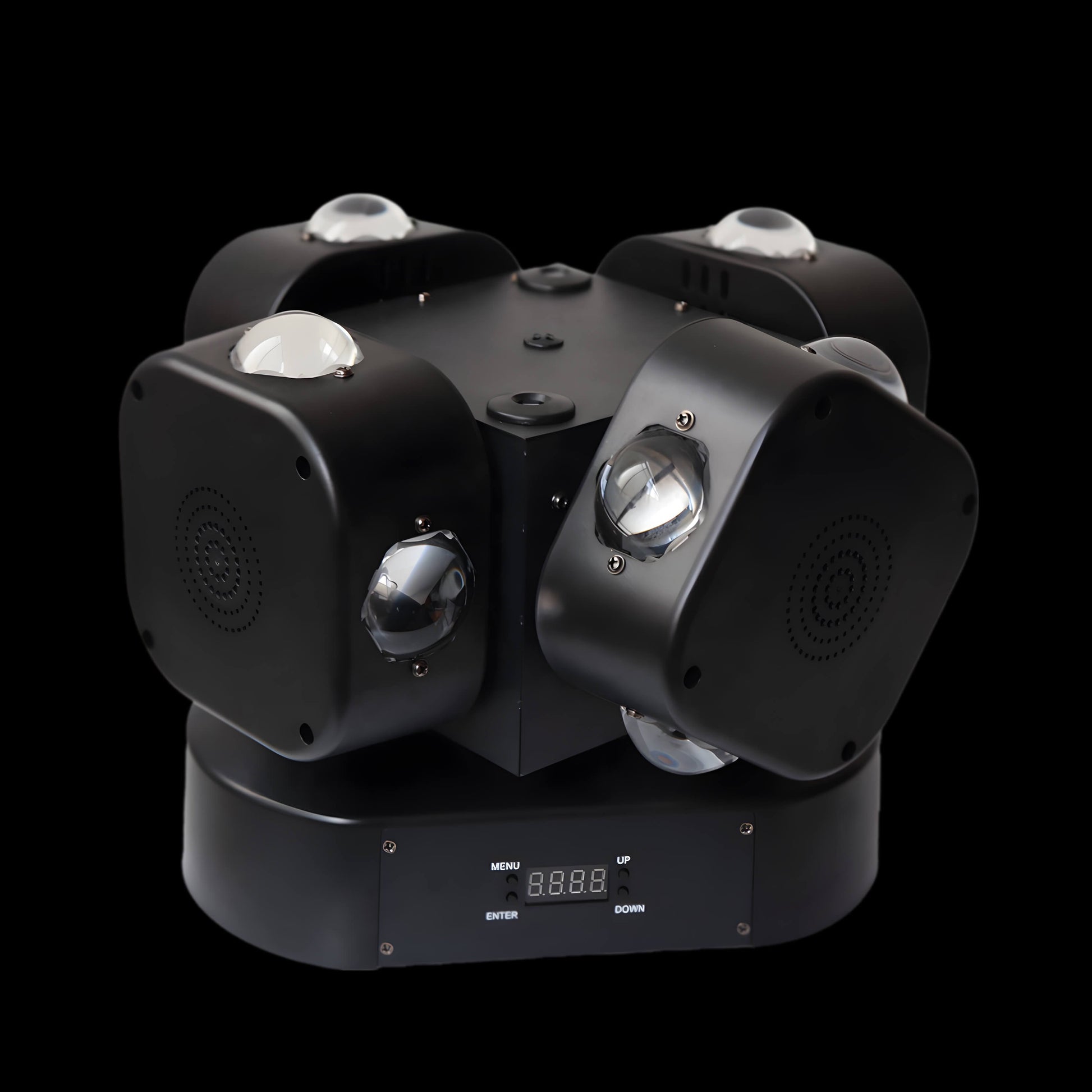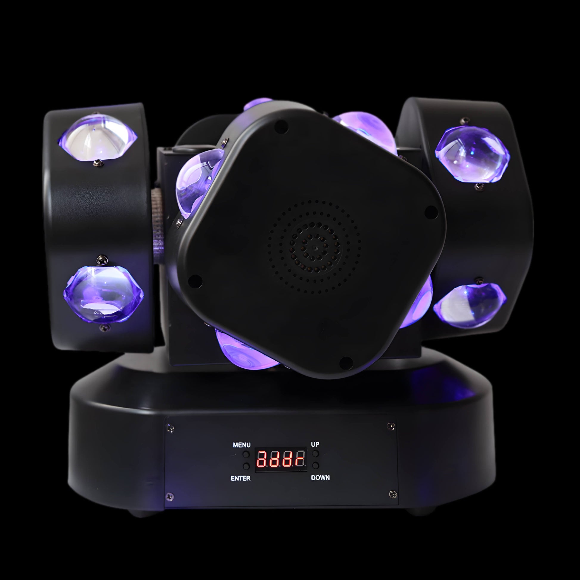 A:The Mini pattern moving headlight provides a range of dynamic lighting effects, including high-frequency strobe lights, red and green party laser lights, and various pattern projections. Its innovative four-arm design allows for endless rotation, creating captivating light and sound shows, perfect for disco party lights and rave lights.